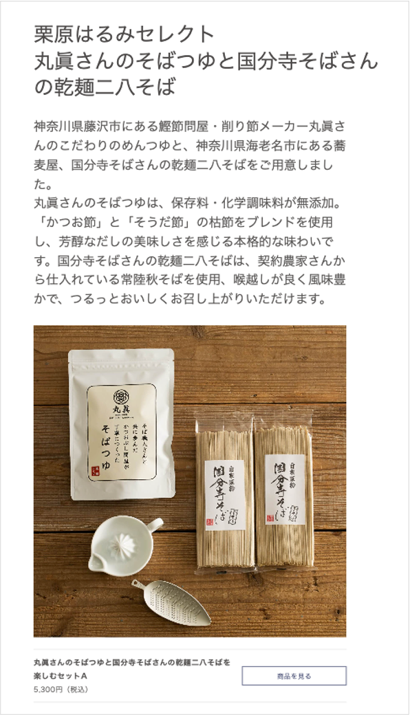 料理家 栗原はるみ 様におすすめとして「そばつゆ<濃縮タイプ> 」を選んでいただきました。栗原はるみ 様の運営するオンラインストア「ゆとりの空間」にて、 「そばつゆ<濃縮タイプ> 」と「国分寺そばさんの乾麺二八そば」がセットで販売されております。すでに完売となったセットもございまして、ご好評いただいております。 夏のギフト商品として、期間限定・数量限定での販売となっておりますので、ぜひご覧ください。