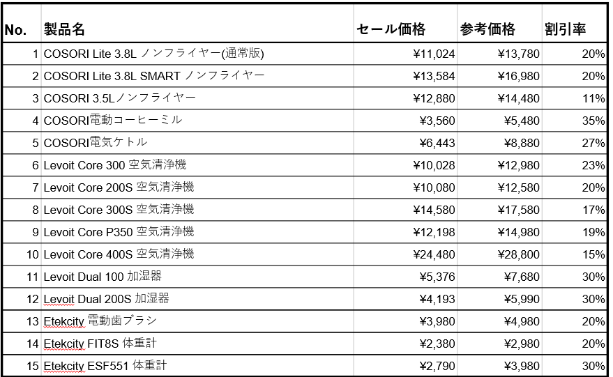 ■その他セール対象のCOSORI &Levoit&ETEKCITY製品