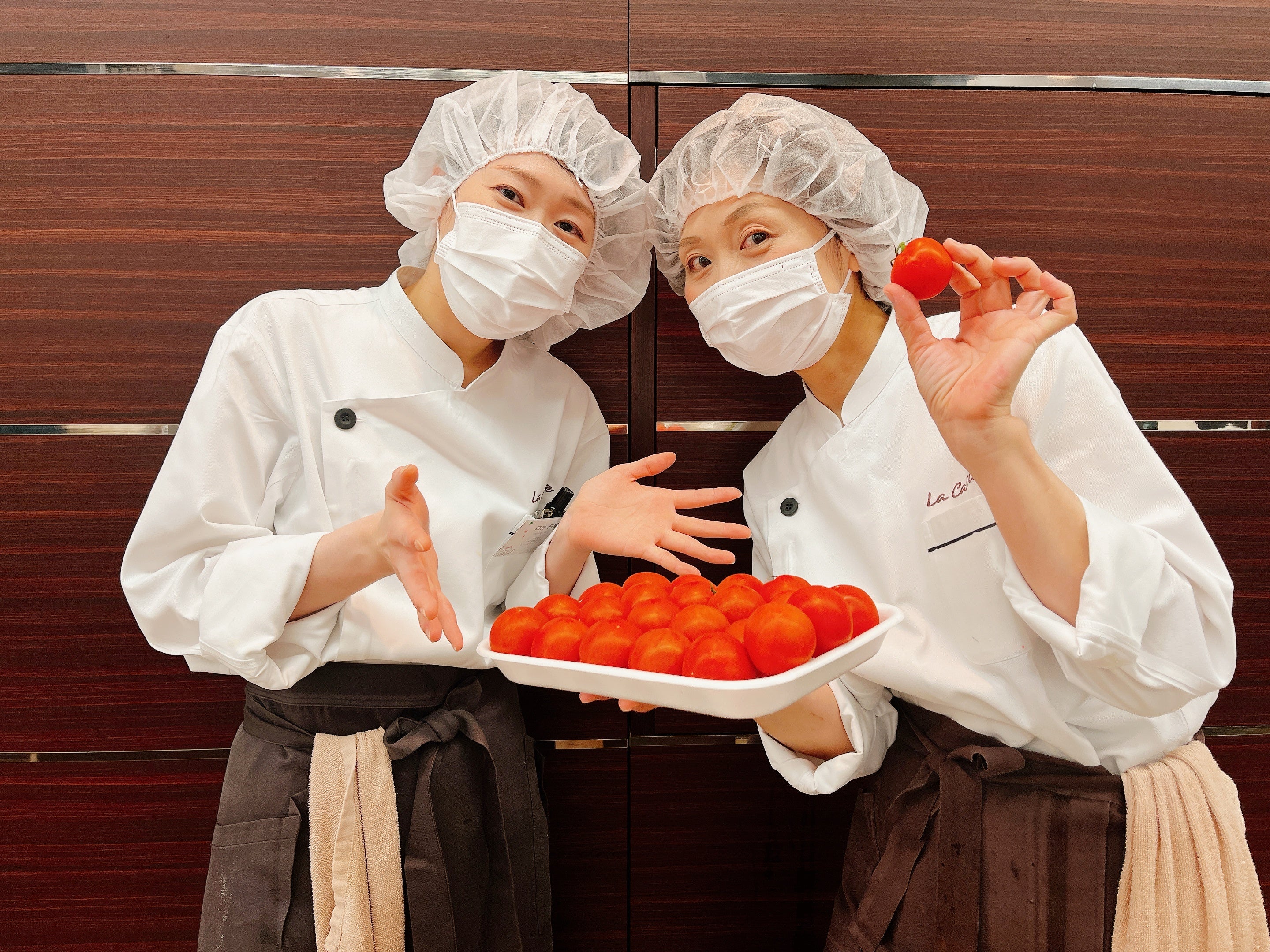 2023年6月27日(火)・28日(水)の2日間、学生が運営する「レストランキャリエール」にて、京都府立丹後緑風高等学校の生徒様が水耕栽培で育てられた無農薬トマトをラ・キャリエール クッキングスクールの教員が調理し、ホテル学科の学生がお客様にサービスをしました。トマトは魚料理の付け合わせとして、トマト本来の旨味を最大限引き出すため、そのままの状態とオーブンで焼いたものをオリーブオイルとお塩で味付けしご提供しました。