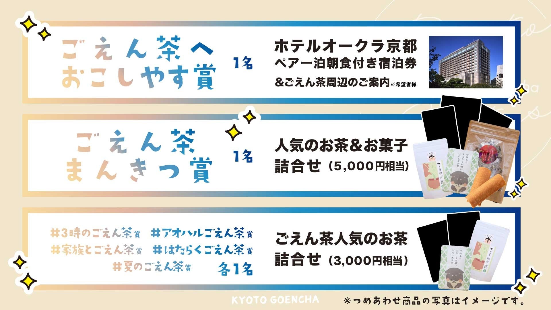 応募者の中から合計7名様に、ホテルオークラ京都ペア宿泊券を目玉とした、ごえん茶オリジナルギフトをプレゼントいたします。
