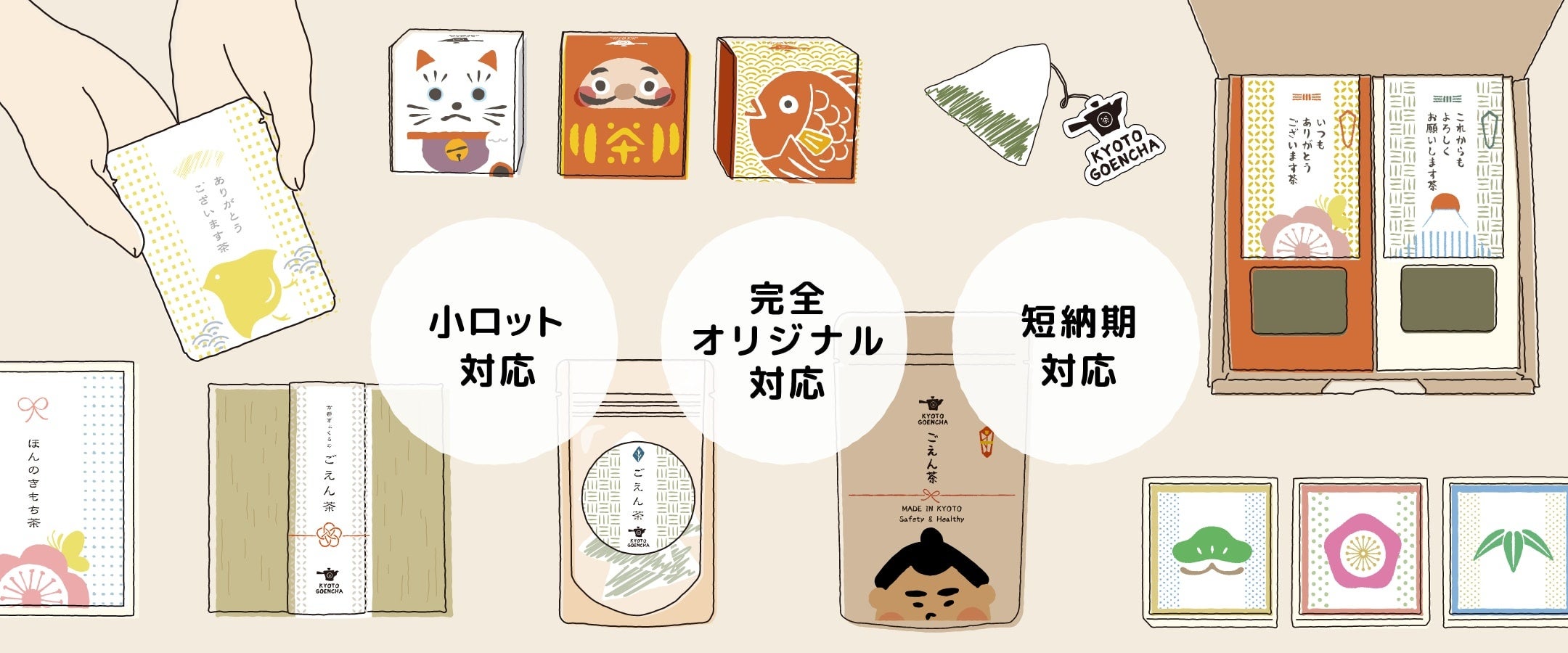 また、お茶商品の企画・デザイン、ノベルティやオリジナルグッズの提案、OEM生産、イベント企画なども行っておりますので、たのしいコラボレーションのお問い合わせ等もお待ちしております。