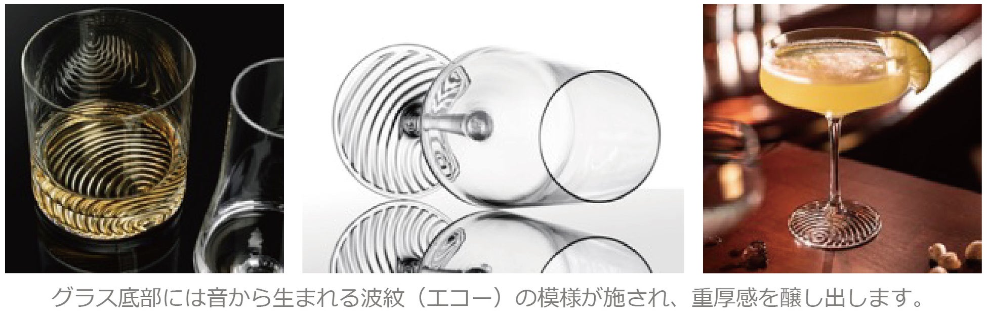 新作”Echo”(エコー)シリーズは、そうした人生の楽しみや感動の響きをグラスの底部や台座に波紋