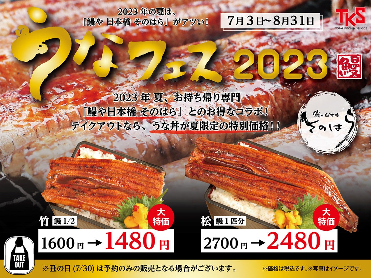 寿司屋や居酒屋を運営する株式会社ティーケーエスと、お持ち帰り専門「鰻や 日本橋 そのはら」がコラボし、お店からのテイクアウトに限り、うな丼竹・松の2種類を特別価格にてお持ち帰りいただけます。