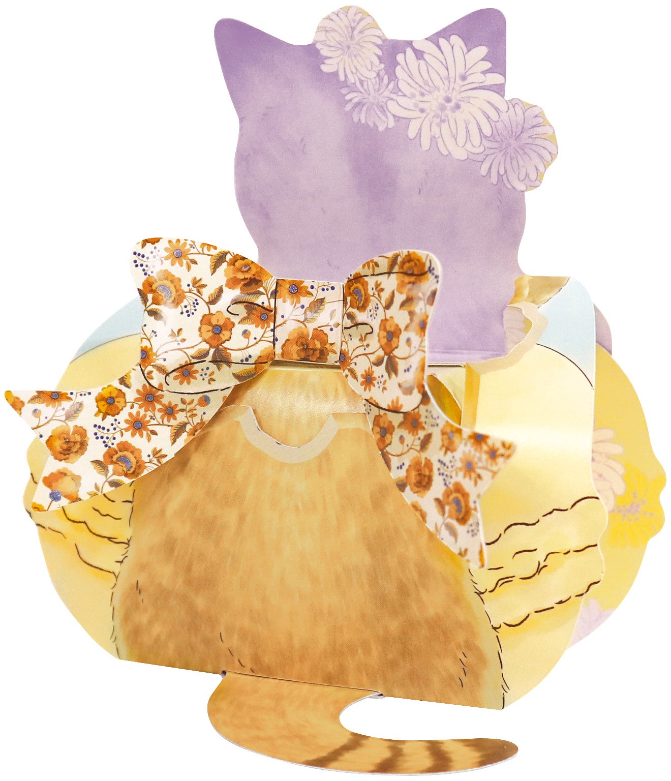 クリザンテームの花に囲まれたジプシー、ヌネット、ジョセフィーニャをデザインした、宝石箱のような2段ボックスです。アフターユース性の高い箱の内側には、愛らしい3匹の猫たちのイラストが隠れています。2種類のガトーと、6種類のキャラメルサンドクッキーを詰め合わせました。