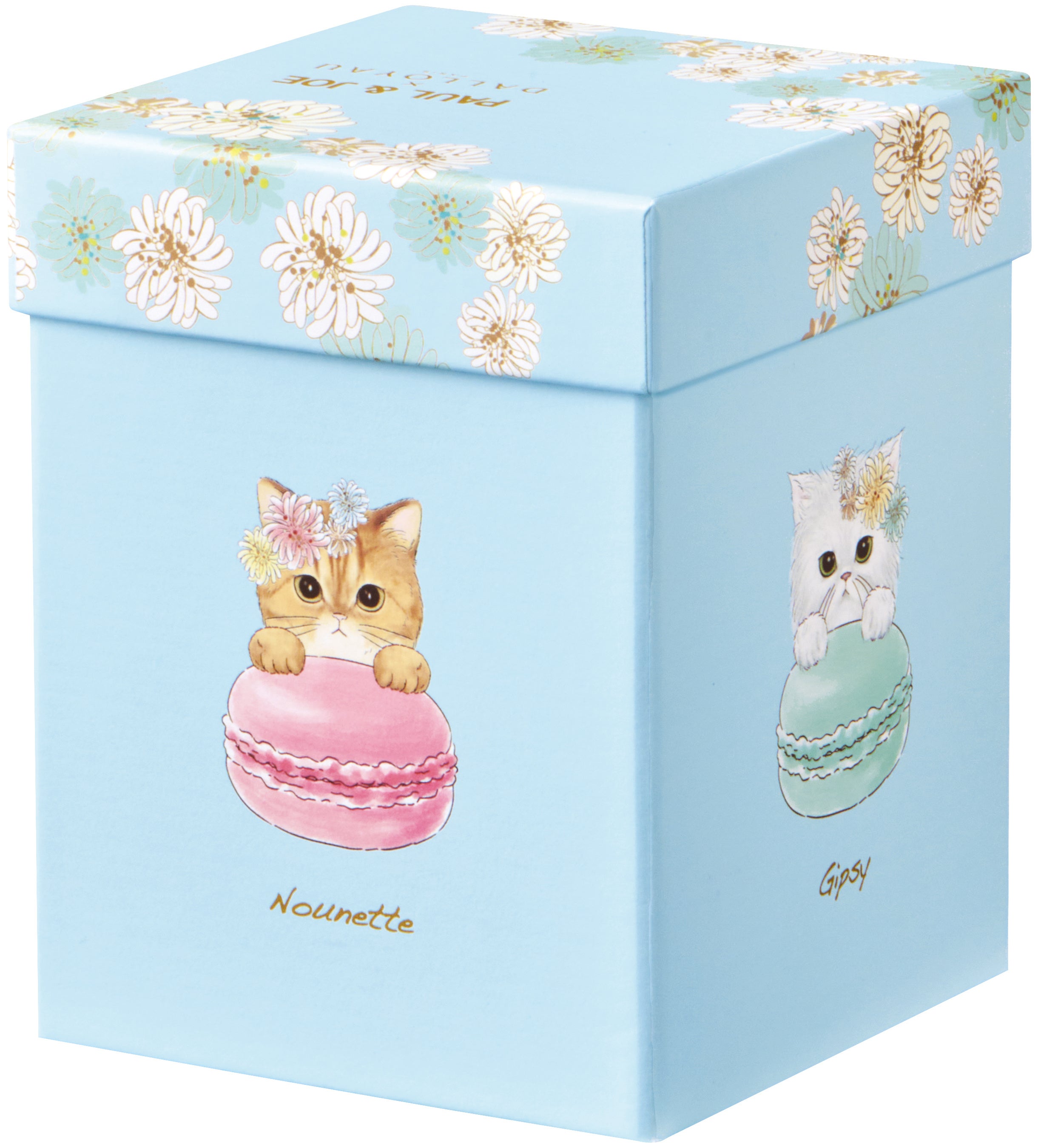 クリザンテームの花冠を纏い、マカロンから顔を出すジプシーとヌネットが愛らしい、立体型の化粧箱に詰め合わせたマカロンギフトです。背中のリボンは、PAUL & JOE 2023秋冬コレクションからセレクトした柄をデザインしました。