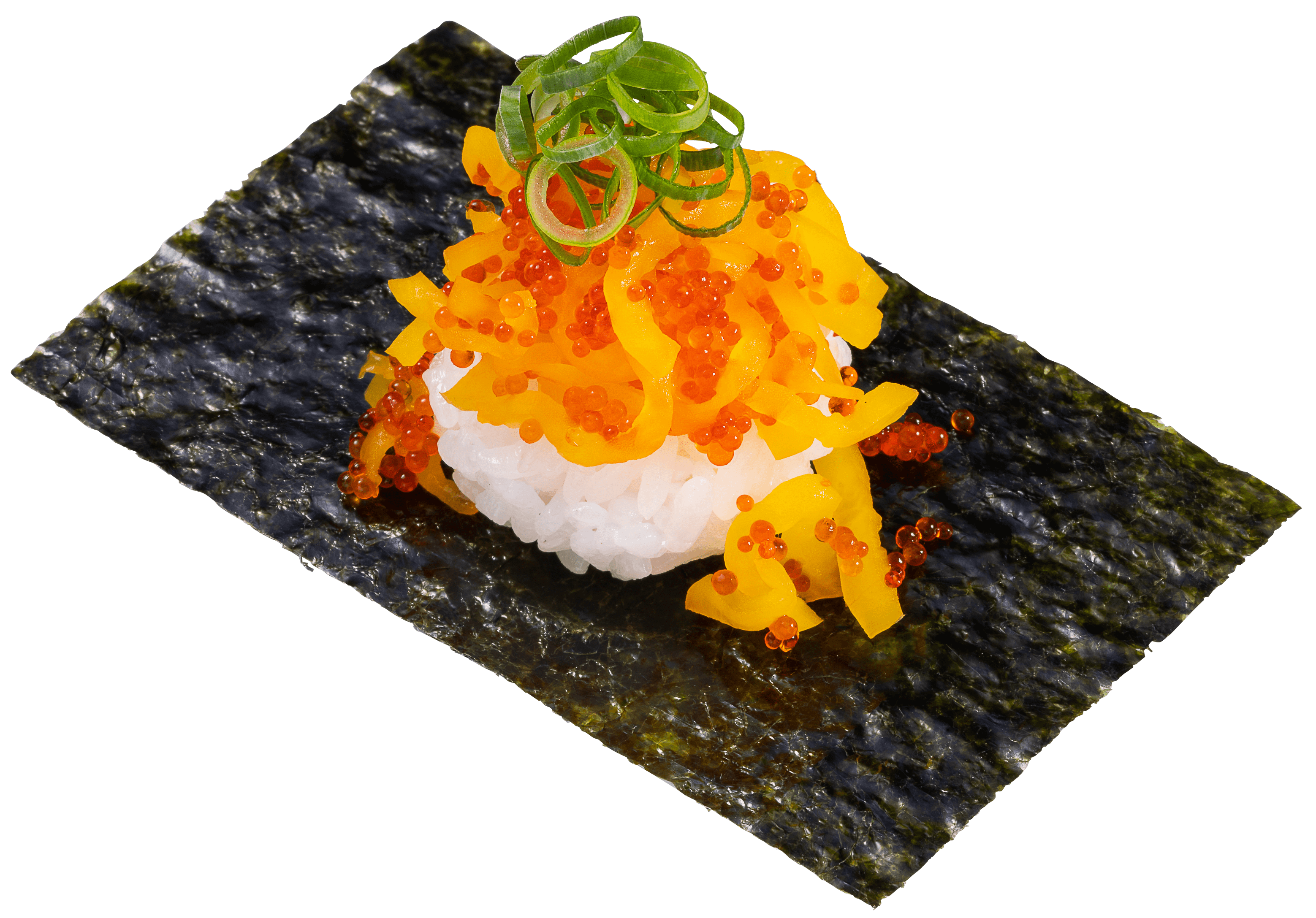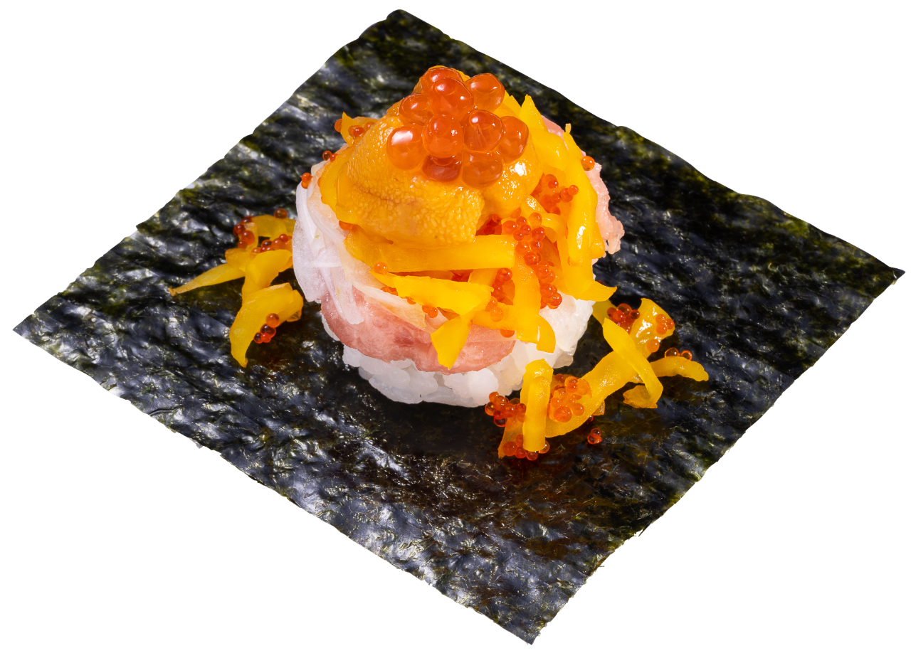 シャリの上にとびたく※1、ねぎとろ、うに、いくらをのせた贅沢な包みです。