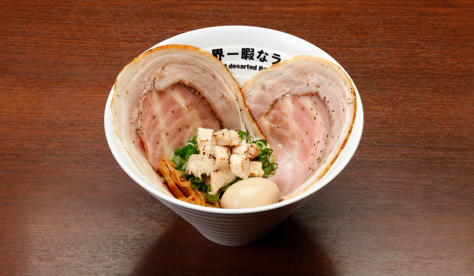 ラーメンの種類はUNCHI株式会社のブランドでは珍しく、ベースとなるラーメン3種類とそれぞれにピリ辛の香味油を加えた3種類の合計6種類をご用意しています。ラーメンの他にも、コロコロにカットしたチャーシューをふんだんにのせている「豚丼」や、にんにく不使用で生姜や大葉を使用した「餃子」、世界一暇なラーメン屋の代名詞ともいえる大判チャーシューの「盛り合わせ」など、幅広いサイドメニューを揃えております。