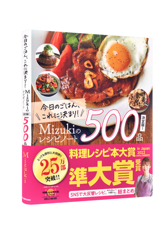『今日のごはん、これに決まり!Mizukiのレシピノート決定版!500品』(以下:『Mizukiのレシピノート』)は、発売わずか2か月で発行部数10万部を突破し、今年の4月には累計25万部(紙+電子書籍にて)を突破。さらに、「2022年度 第9回料理レシピ本大賞 in Japan」では料理部門 準大賞を受賞、著者・MizukiのInstagramフォロワーも110万人を突破し、多くの方から支持を得ています。