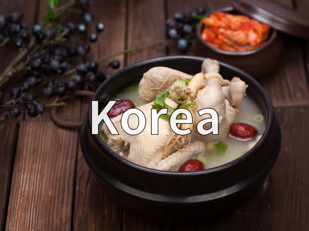 韓国:サムゲタン(鶏肉のスープ)、冷麺、ビビンバ、参鶏湯、マッククスや、チョル麺など