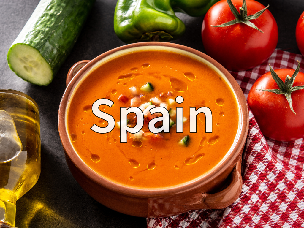 スペイン:ガスパチョ(冷製スープ)、新鮮な果物・野菜など