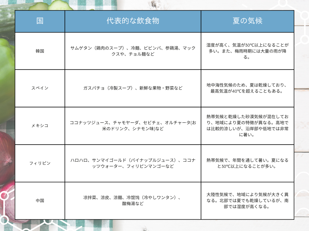 日本ではそうした増加する夏バテの予防として、ビタミンB1を多く含む食品としてうなぎや玄米、クエン酸を多く含む食品として梅干しやレモン、塩分やミネラルを補給する代表例としてスポーツドリンクなどが定着しつつある中、ロコタビでは世界の定番品を、現地に住む日本人にヒアリングを行いまとめた。これから海外進出や海外調査を検討される企業にとってヒントになれば幸いである。