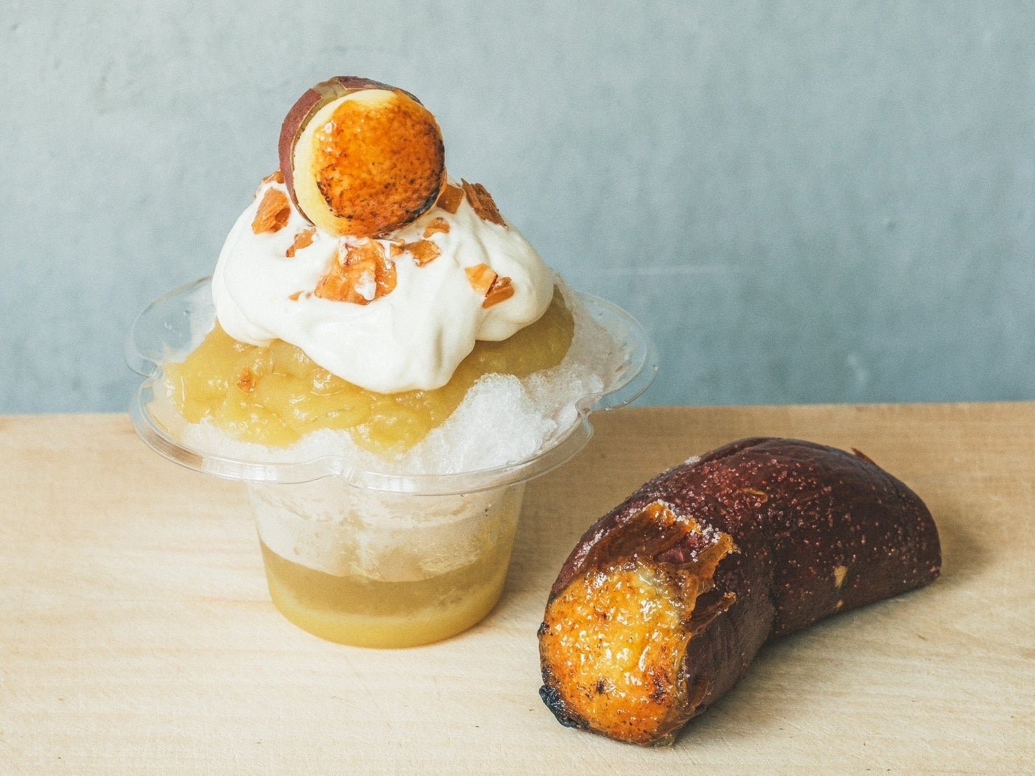 1つ1つ丁寧に壺で焼き上げた芋の贅沢蜜シロップとペーストが合わさった特別なかき氷