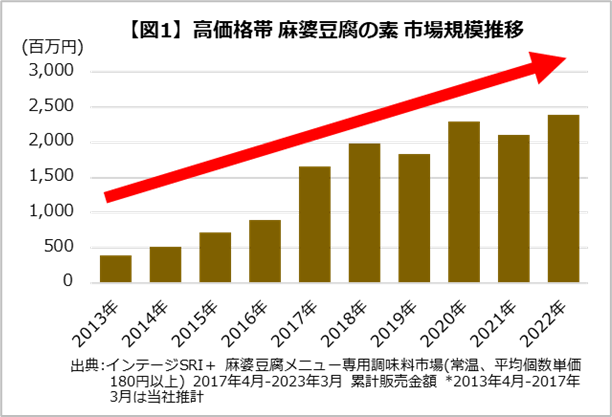 中華メニュー用調味料市場の中で、本格・こだわり領域に属する高価格帯の麻婆豆腐の素の市場規模は中長期的に拡大しています(図1参照)。