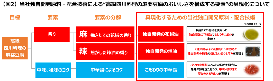 「Cook Do®」<極(プレミアム)麻辣麻婆豆腐用>は、「Cook Do®」がこれまで培ってきた原料・製法についての知見・技術を結集し、四川料理の特徴である麻(マー)・辣(ラー)(※2)を極め、中華調味料・香辛料等にとことんこだわり絶妙なバランスで配合した、麻婆豆腐好きのための麻婆豆腐の素です。当社の研究開発部門が、“高級四川料理の麻婆豆腐のおいしさを構成する要素”を徹底的に分析し、独自に開発した原料や配合技術で具現化しました(図2参照)。