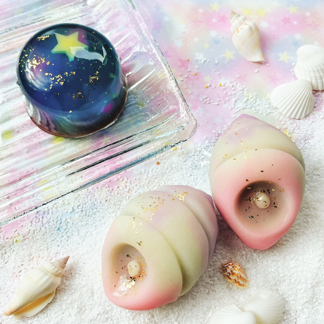 和菓子の道具を使い、巻貝の形に成形し、海辺を表現するために凹ませた部分に透明の寒天と砂糖を煮詰めた錦玉羹を流し込みました。実際には「貝殻」には存在しないのですが、メルヘンなイメージで巻き貝の凹みに真珠(練り切り)を一粒乗せ、仕上げに星の砂をイメージした金箔を散らしました。