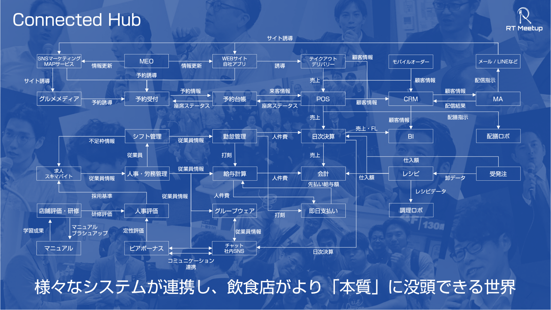 またConnected Hub”という取り組みも行っています。これは、人と人のつながりだけでなく、システム間のつながりを活性化するためのプロジェクトで、国内標準のAPIリファレンスの制定に取り組んでいます。これにより、飲食店がレストランテックツールを採用した際のデータ連携の問題を解決し、結果的に人の作業を減らすことを目指しています。