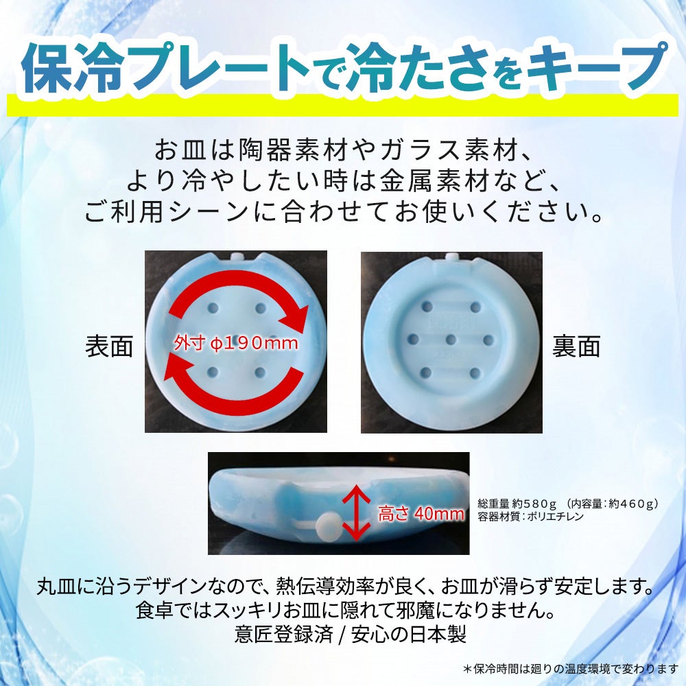丸皿のお皿で使用することを想定しており、丸皿に沿うデザインのため熱伝導率が良く、保冷効果を保ちやすくしています。底面は冷温プレートを置くテーブルからの熱の影響を少しでも軽減する為に接触面を少なくしながらも安定する形状で、保冷効果を持続する保冷剤量(約460g)を確保する為に高さも40mmあることによって3時間経過しても適温を保つことができます。