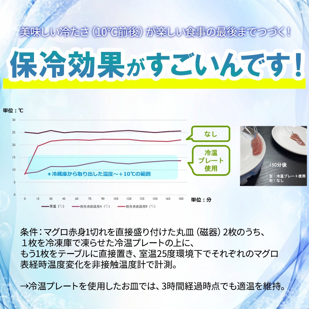条件:マグロ赤身1切れを直接盛り付けた丸皿(陶器)2枚のうち、1枚を冷凍庫で凍らせた冷温プレートの上に置き、もう1枚をテーブルに直接置いて室温25度の環境下でそれぞれのマグロ表面経時温度変化を非接触温度計で計測。