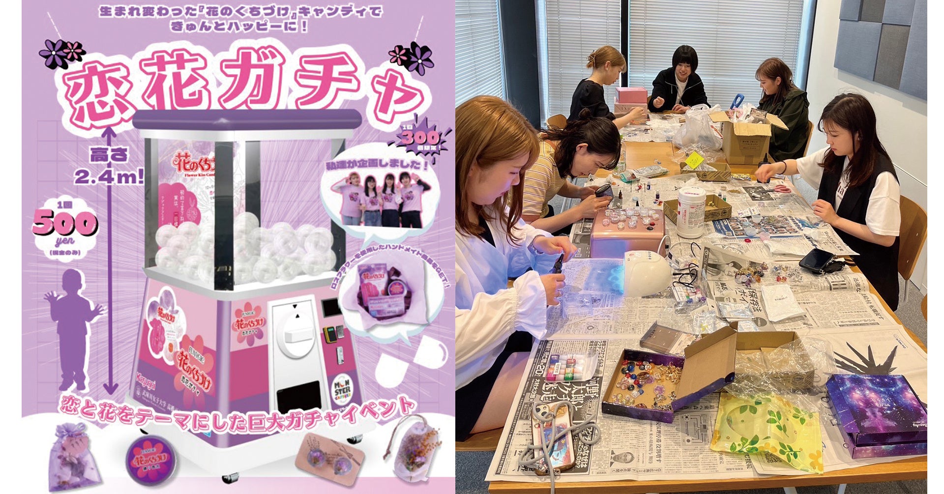 イベント会場に設置される巨大ガチャのカプセルには、ジップロック型の特別版パッケージ「花のくちづけ」と共に、ロスフラワーを使用した学生たちのハンドメイド製品、恋のメッセージカード、ロスフラワー問題を説明するカード等を入れ、キャンディの魅力と SDGsをアピールします。