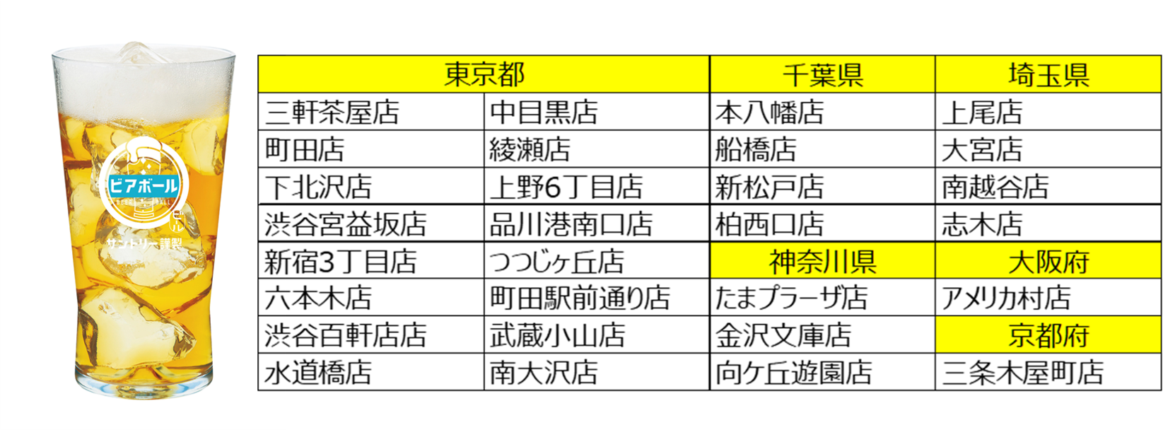 ※以下の店舗は、ビアボールがより美味しく感じられるように開発された「ビアボール専用タンブラー」にてご提供します。一味違うビアボールをご体験ください。