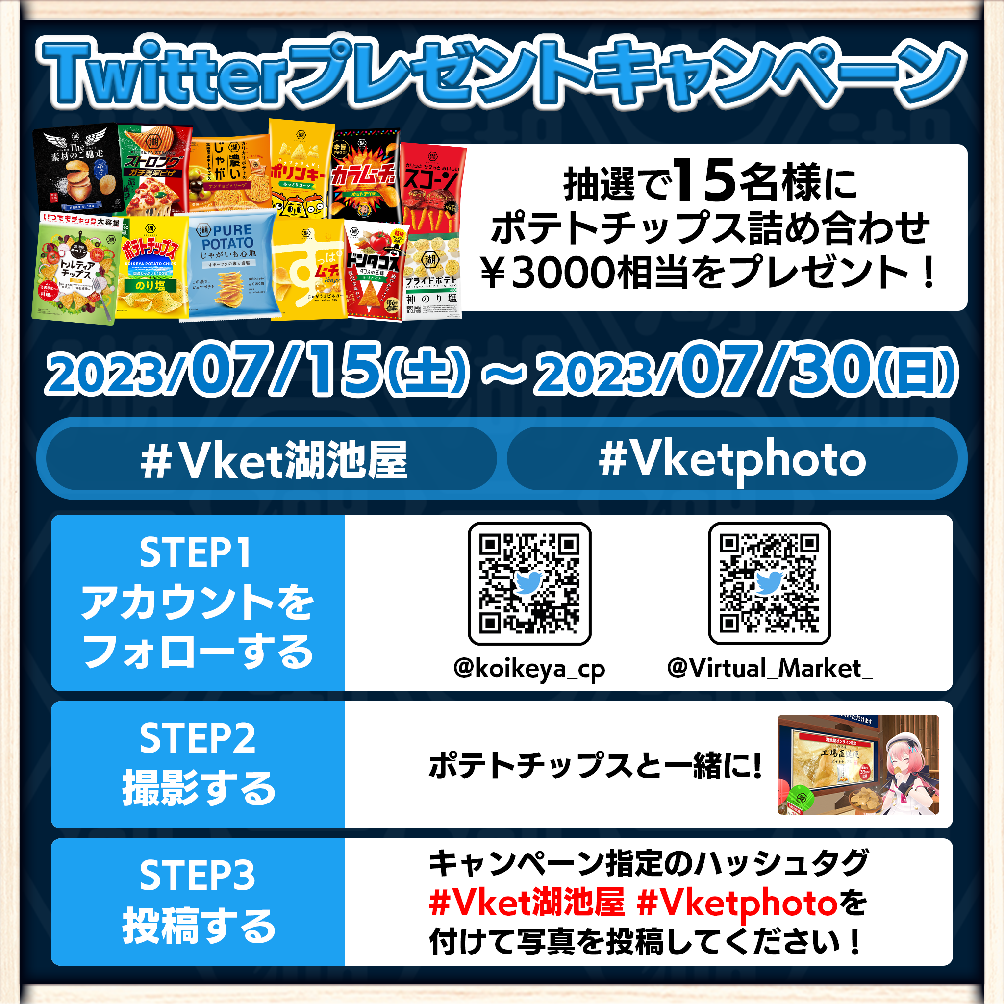 さらに、通常は湖池屋のECサイトでしか購入することのできない「湖池屋工場直送便 ポテトチップス」や、この夏の新商品がバーチャルマーケット内で特別限定価格にて販売されますので、楽しみにお待ちください。