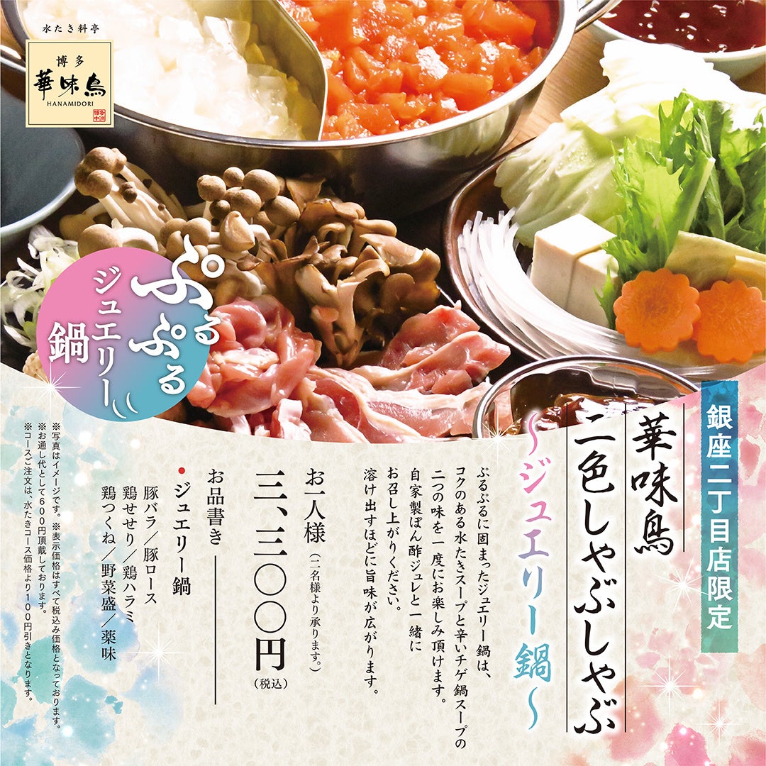 1.「華味鳥二色しゃぶしゃぶ~ジュエリー鍋~」1人前3,300円(税込) ※銀座二丁目店のみ提供