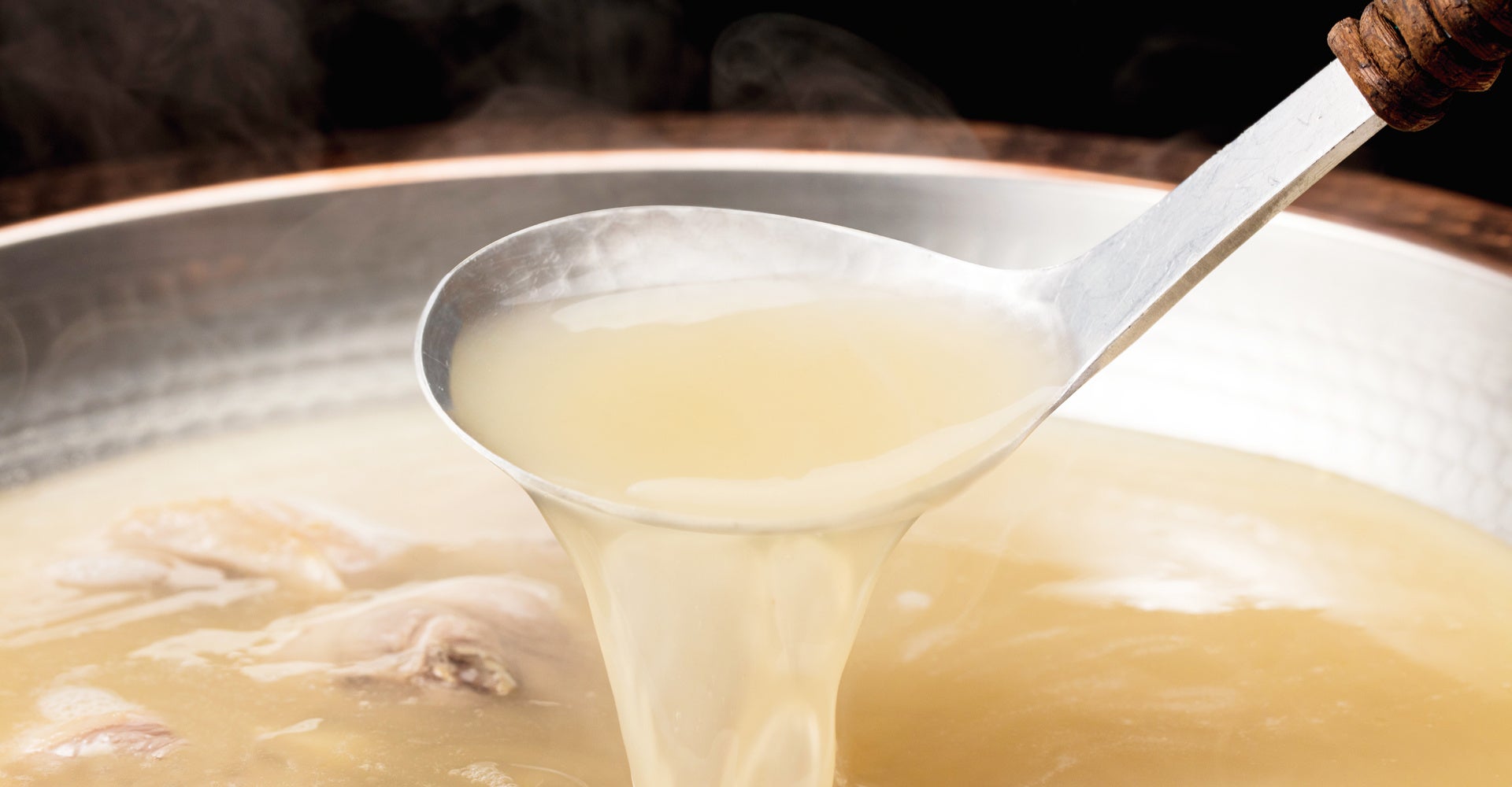 水たき料亭 博多華味鳥のスープは原料に100%九州産の鶏の脚ガラに華味鳥の丸鶏を合わせて炊き出す「鶏かさね炊き」という製法で、濃厚でありながらサラリとした口当たりに仕上げております。