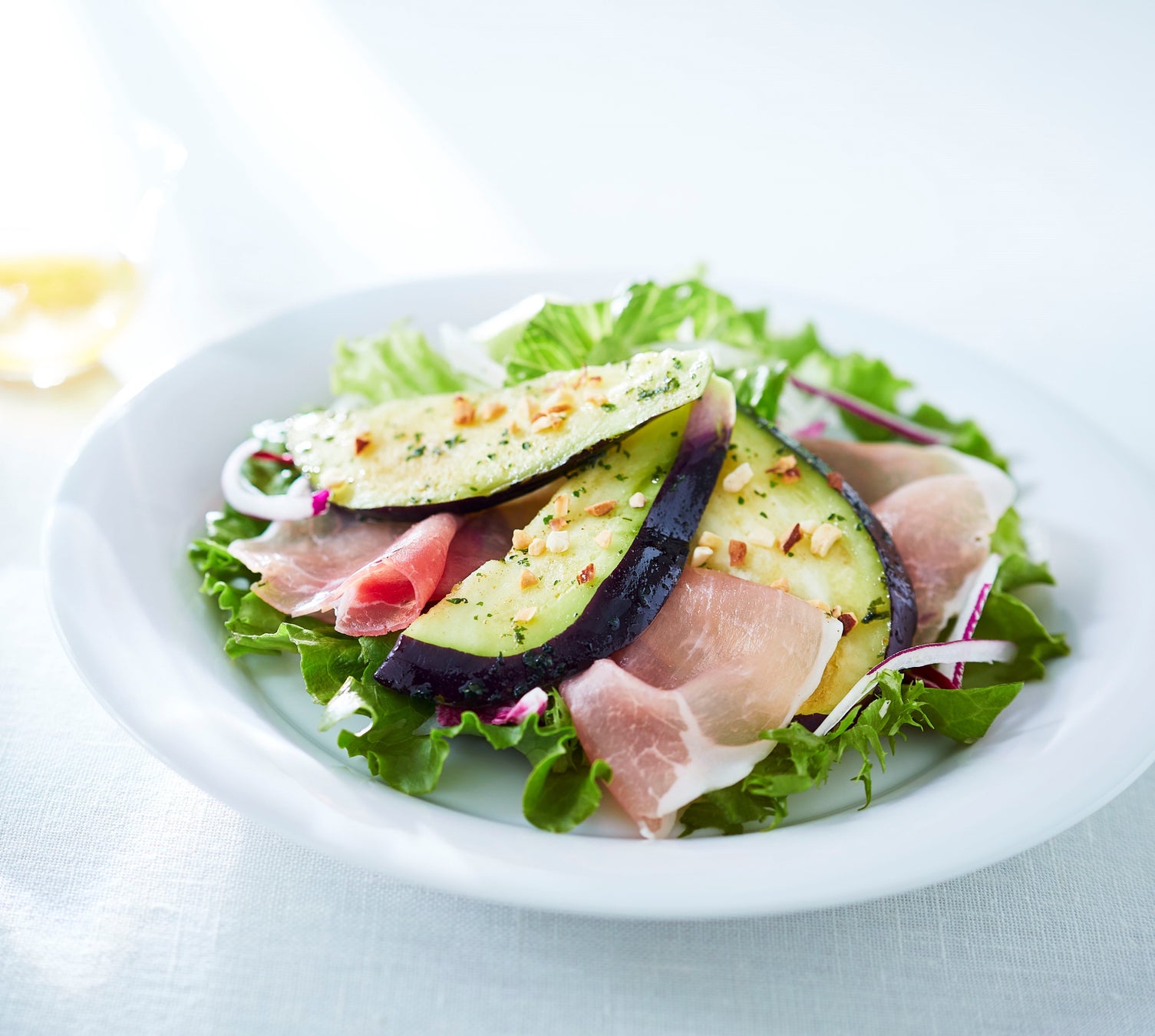 塩水で軽く下味をつけ、ハーブ&オリーブオイルで和えた水茄子と、しっとりとした食感で、塩味と旨みのバランスが良い北海道産生ハムが好相性。2種のマスタードを使い、香りと味に深みを出したマスタードドレッシングが、水茄子と生ハムのおいしさを引き立てます。