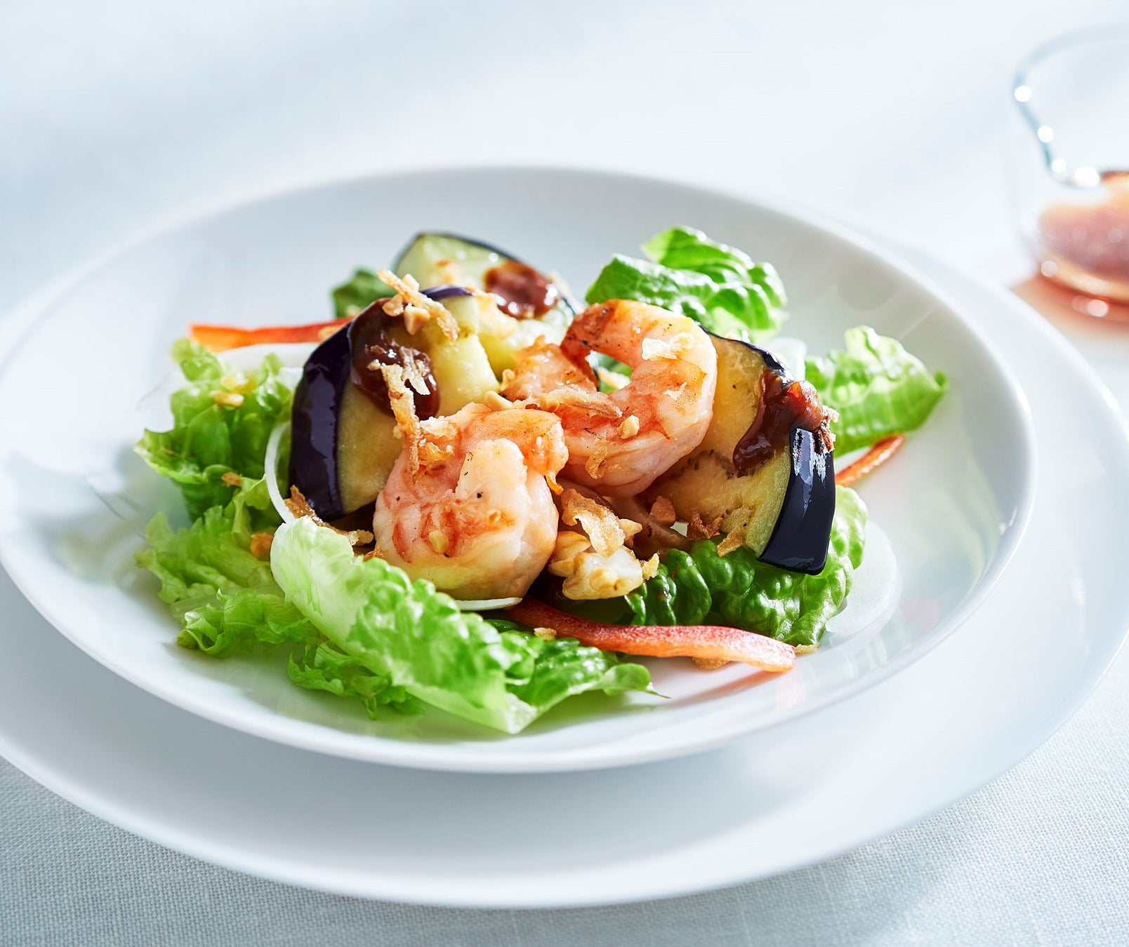 揚げ「大和丸なす」とグリル海老のサラダ 旨み味噌ソース ¥594(100g)
