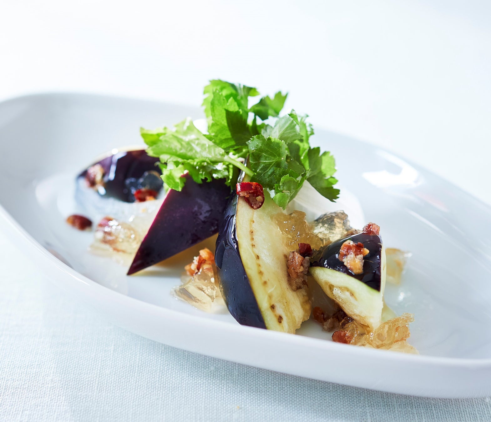 生で食べられる水茄子の美味しさを存分に味わえるサラダ。アクが少なく水分を多く含んでおり、ほのかな甘みもあるのが水茄子の特長です。さっぱりとしたなすの味わいに、焦がしたアーモンドとガーリック・アンチョビの旨味が好相性。醤油やビネガーを合わせたさっぱりとしたジュレとご一緒に。