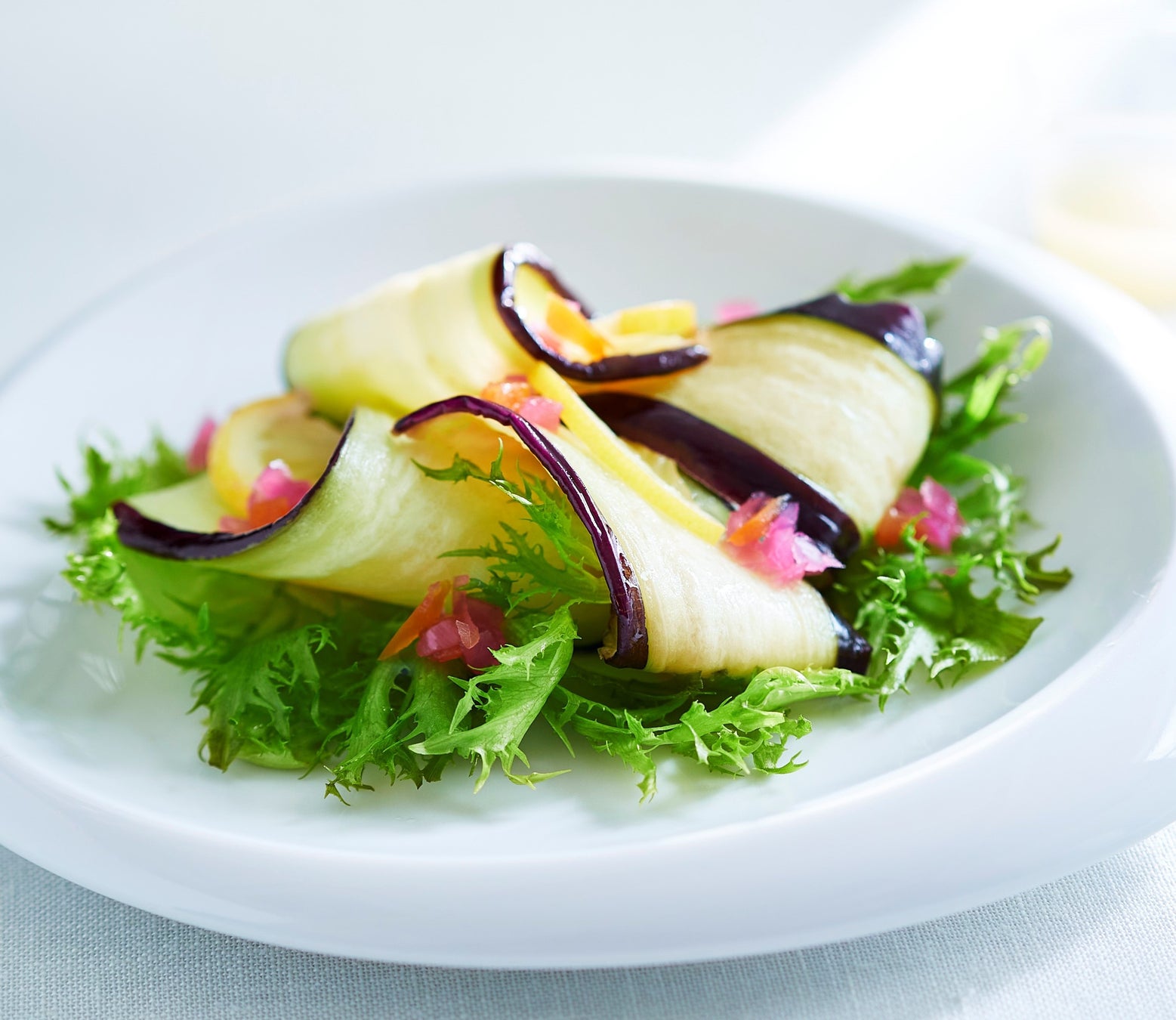 アクが少なく、果肉が軟らかい熊本県産「赤なす」の優しい甘みと風味を堪能できるサラダ。なすは塩水につけたのち、刻んだレモンとオリーブオイルでマリネしています。レッドオニオンとパプリカのピクルスがアクセント。フランス産岩塩と浅く漬けた塩レモンのソースで、この時期らしいさっぱりとした味わいです。