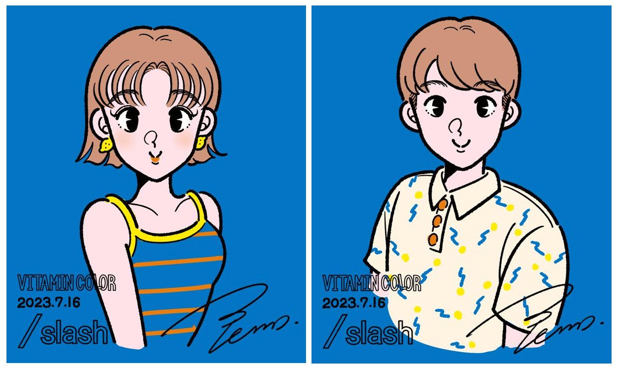 週末にはサンレモ氏にご来館いただき、7月15日(土)にサイン会、翌16日(日)に似顔絵イベントを行います。サイン会は当日13〜18時までの間にイラスト本“VITAMIN COLOR”を購入いただいた方全員にその場でサインを、似顔絵イベントのデザインは夏らしいブルートーン1色に“VITAMIN COLOR”とslash川崎のロゴ、そしてサインが入ったオリジナル。ウエストからお顔までは、サンレモ氏のどこか懐かしくて新しいニューレトロなタッチで、本イベントを予約したゲストのために1枚1枚丁寧に仕上げます。サンレモ氏の作品やオリジナルコラボグッズでカラフルに飾り付けられたslash川崎で、イベントも楽しみながらアートなホテルステイを体験しませんか。