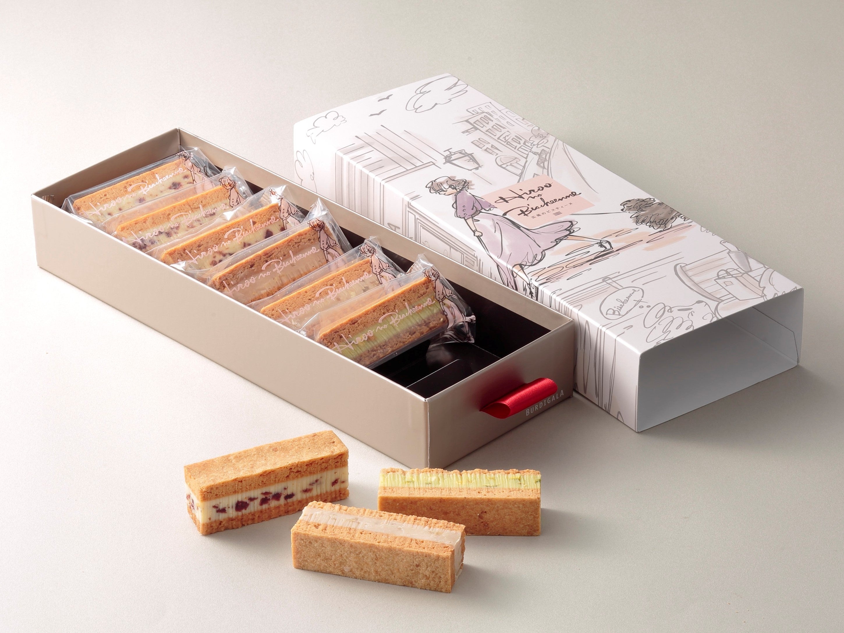 ふわふわのワッフル生地でクリームやフルーツをサンドした人気商品。このセットでしか味わえない限定フレーバー5種入り。丸の内駅舎のイラスト入りのパッケージでお土産にぴったりです。※パッケージデザインは9月初旬にリニューアル予定です。