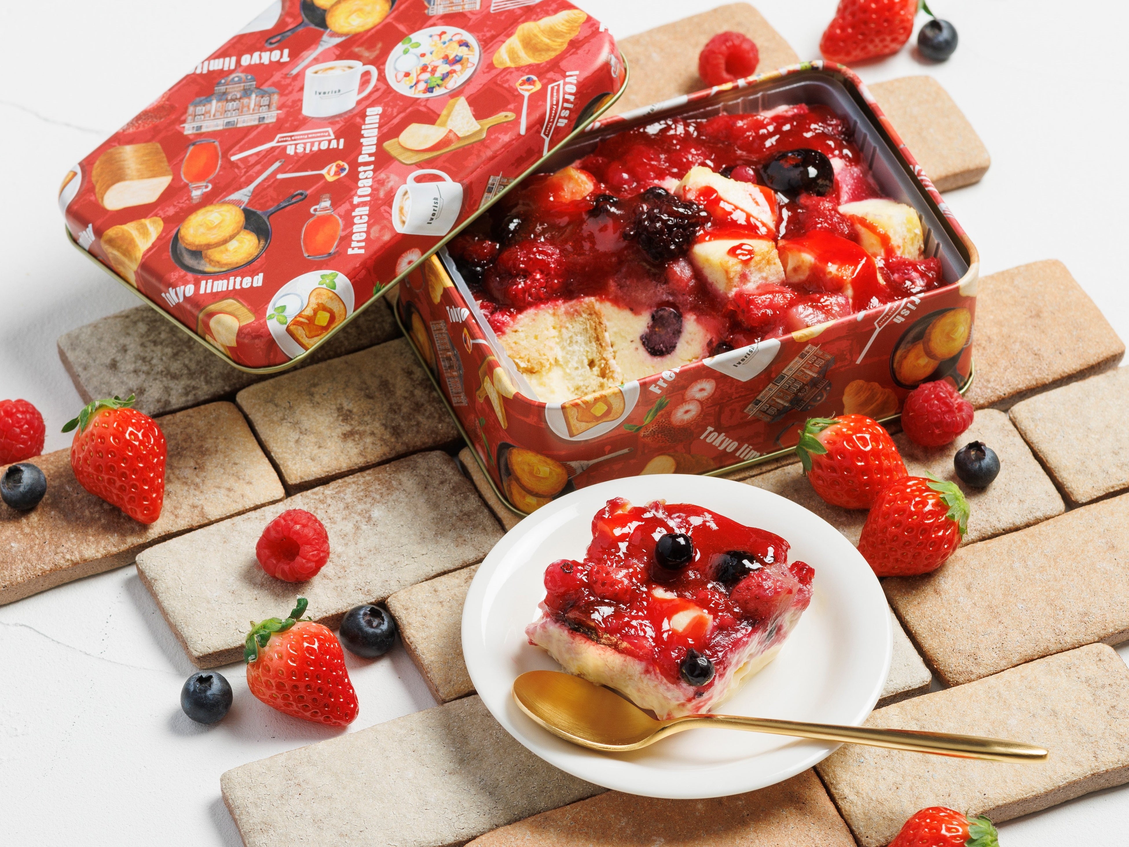 鮮やかなベリーがまぶしいフレンチトーストプディング。東京駅などのイラストを散りばめたオリジナルデザインの限定缶に入ってます。持ち歩きに便利な冷凍ケーキのため、列車での⻑時間移動におすすめ。さらに暑い時期は半解凍でも、アイスケーキのように美味しく召し上がりいただけます。