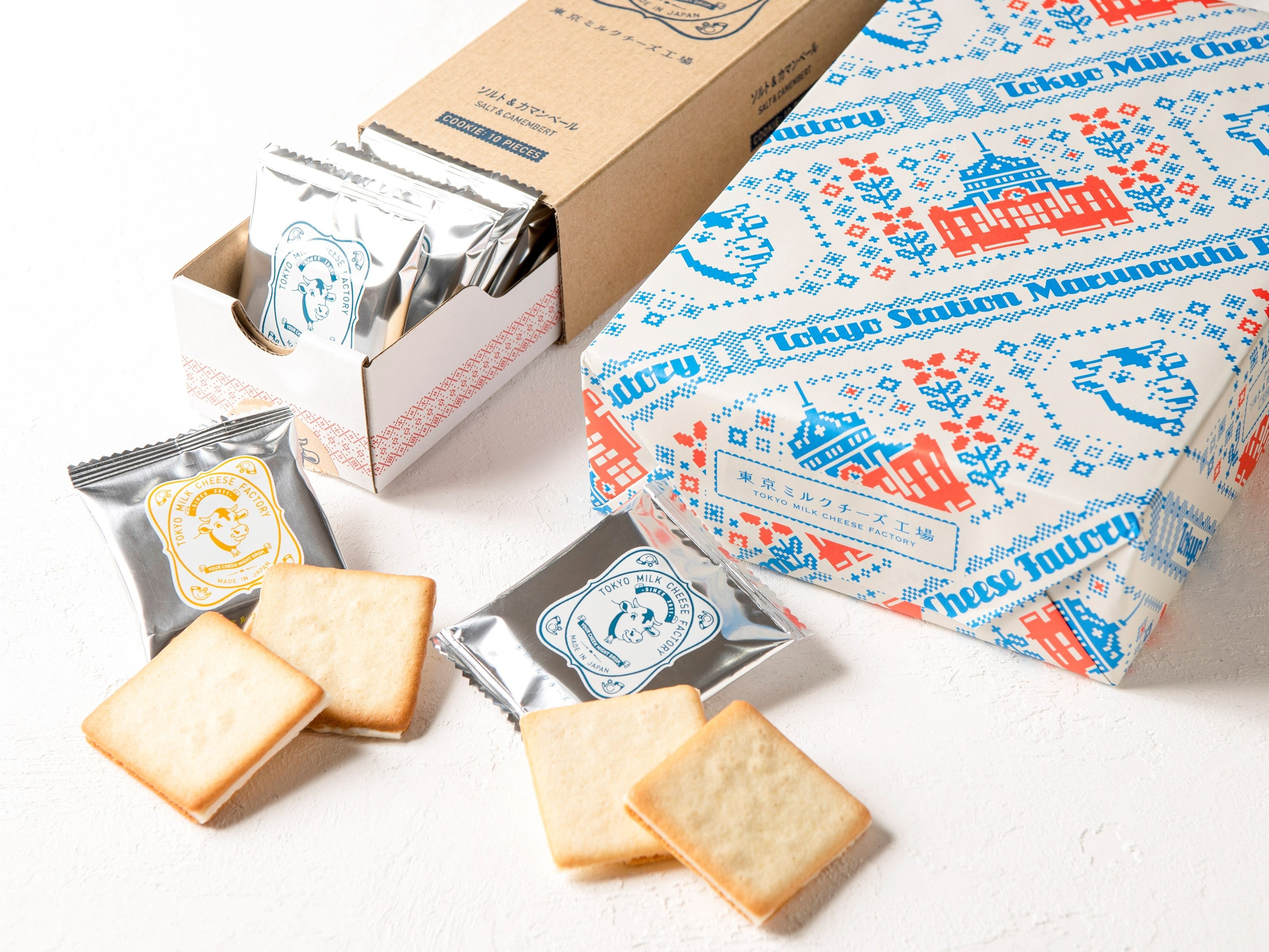 東京駅限定の駅舎PKG。東京ミルクチーズ工場の大人気商品、ソルト&カマンベールクッキーと蜂蜜&ゴルゴンゾーラクッキーが、それぞれ10枚ずつ入っています。大事な方への贈り物に自分へのご褒美に是非ご利用ください。