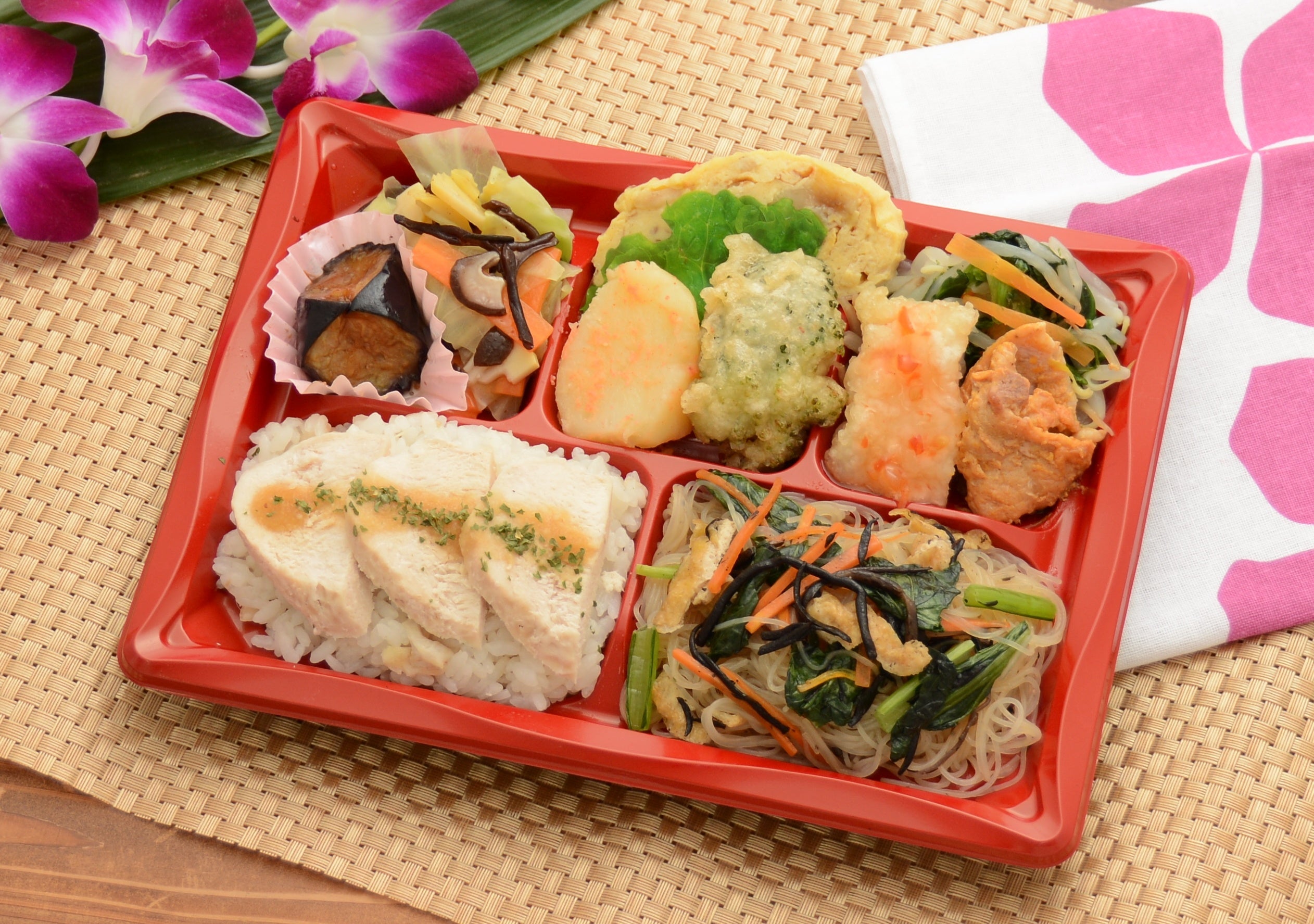 健康に気遣いながら、日々の食事に手軽に取り入れられるお弁当です。今回はアジアンをテーマに普段食べないようなメニューや味付け、静岡県産品の食材で新たな発見をしていただけるお弁当です。