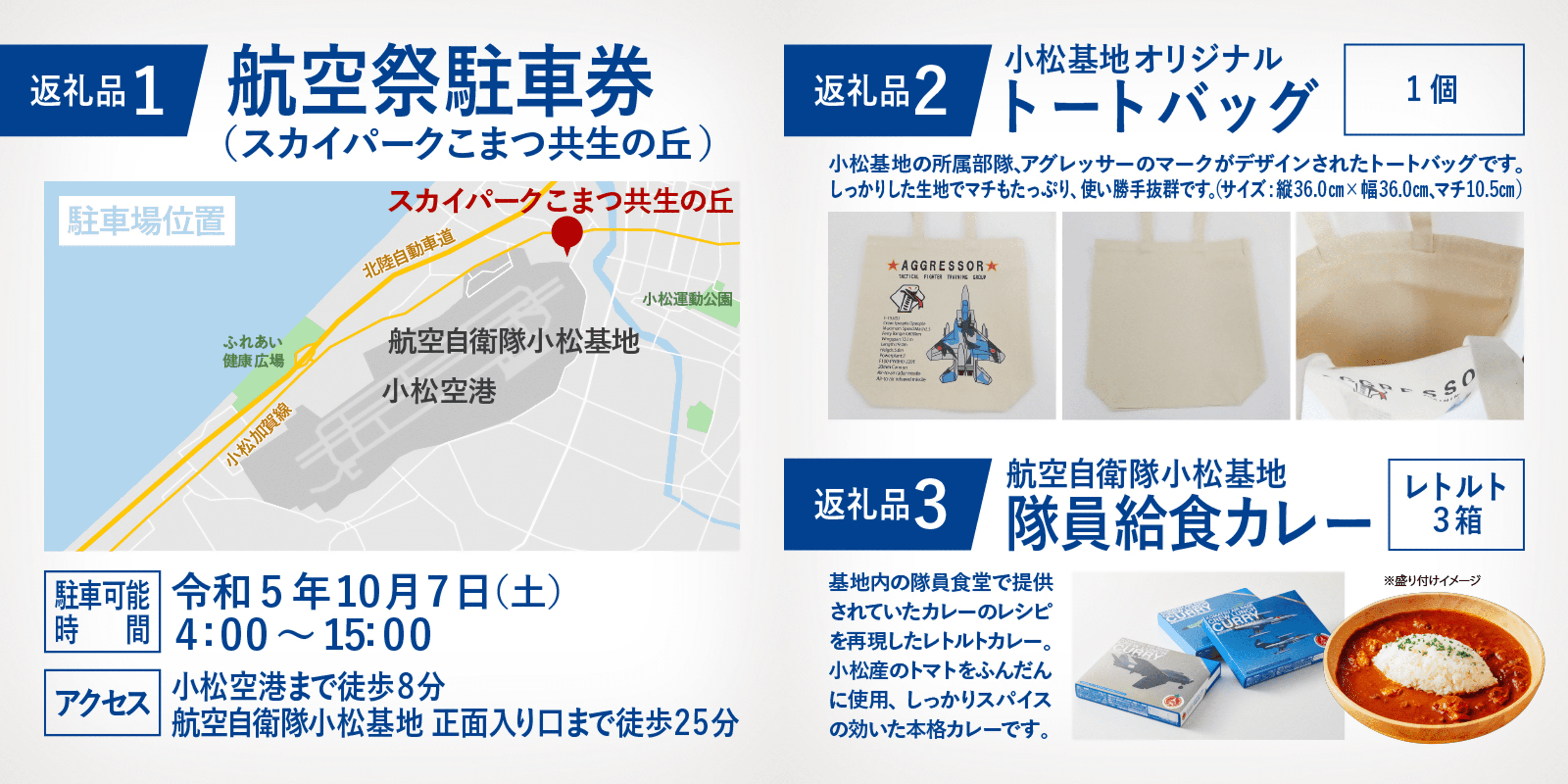 石川県小松市では 、「小松基地航空祭 2023」当日に駐車できる「スカイパークこまつ 共生の丘」の駐車場利用券と、小松基地関連グッズ(オリジナルトートバッグ・小松基地隊員給食カレー)のセットを、7月からふるさと納税の返礼品として提供します。