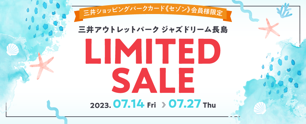 7月14日(金)~7月27日(木)の期間では、三井ショッピングパークカード≪セゾン≫会員様を対象としたセール「LIMITED SALE」を開催、続いて、7月28日(金)~8月20日(日)の期間で、半期に一度の大型セール「SUPER OUTLET SALE」を開催します。夏物アイテムをおトクにお買い物いただけます。