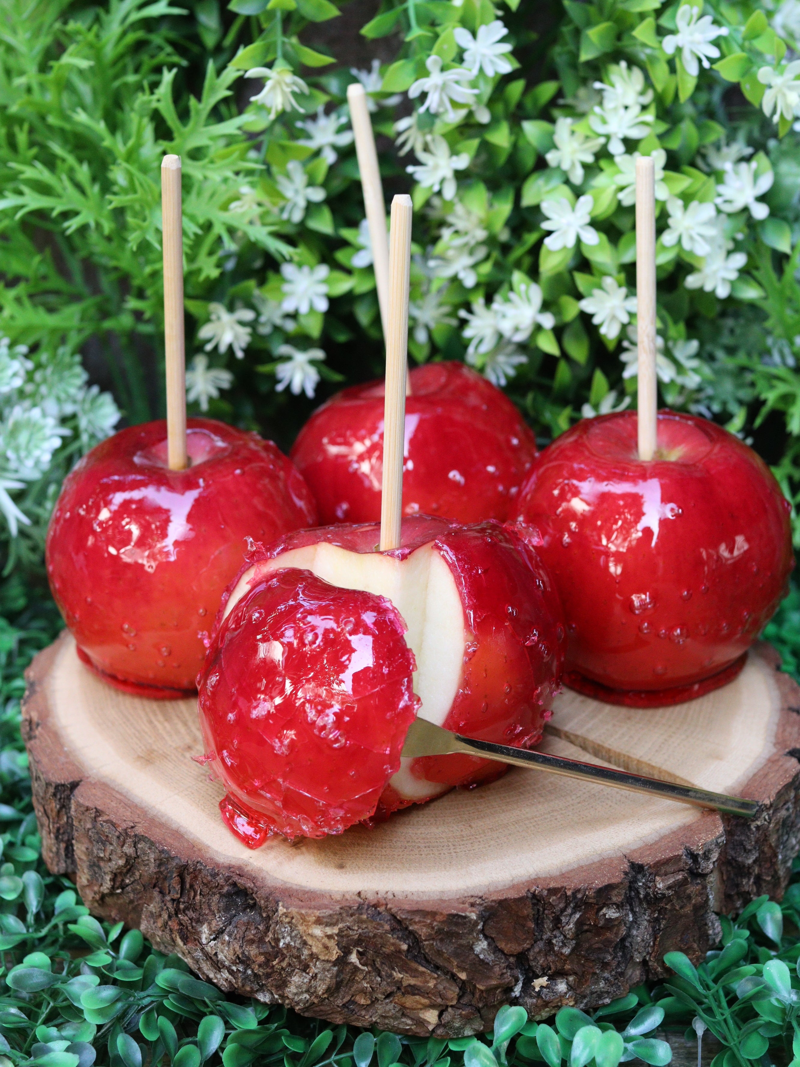毎⽉その時期に合うブランドりんごを全国から取り寄せ、選別して作る本格りんご飴。りんごは「硬さ」「⽢さ」「酸味」「⾹り」「果汁」が、季節や産地によって全く異なるため、旬のりんごの旨味を最⼤限に引き出すための、飴作りの⼯程にもこだわりがあります。ジューシーな果汁を感じるりんごの⾷感と飴の⾷感に⼀体感が⽣まれるようにパリパリに仕上げ、飴は⼝の中で⼀瞬で溶け混ざり合うよう薄くコーティングしています。そのため⽢みの中に感じるりんご本来の酸味と⽢い⾹りが⼝いっぱいに広がります。