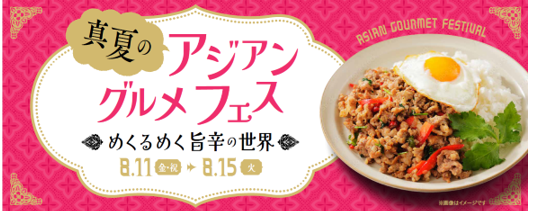 8月11日(金・祝)~8月15日(火)の期間では、香辛料やスパイスが効いたアジアンフード特有の辛さを堪能できる「真夏のアジアングルメフェス」を開催します。“旨辛”を通して、夏の暑さを吹き飛ばす刺激的な体験をお届けします。
