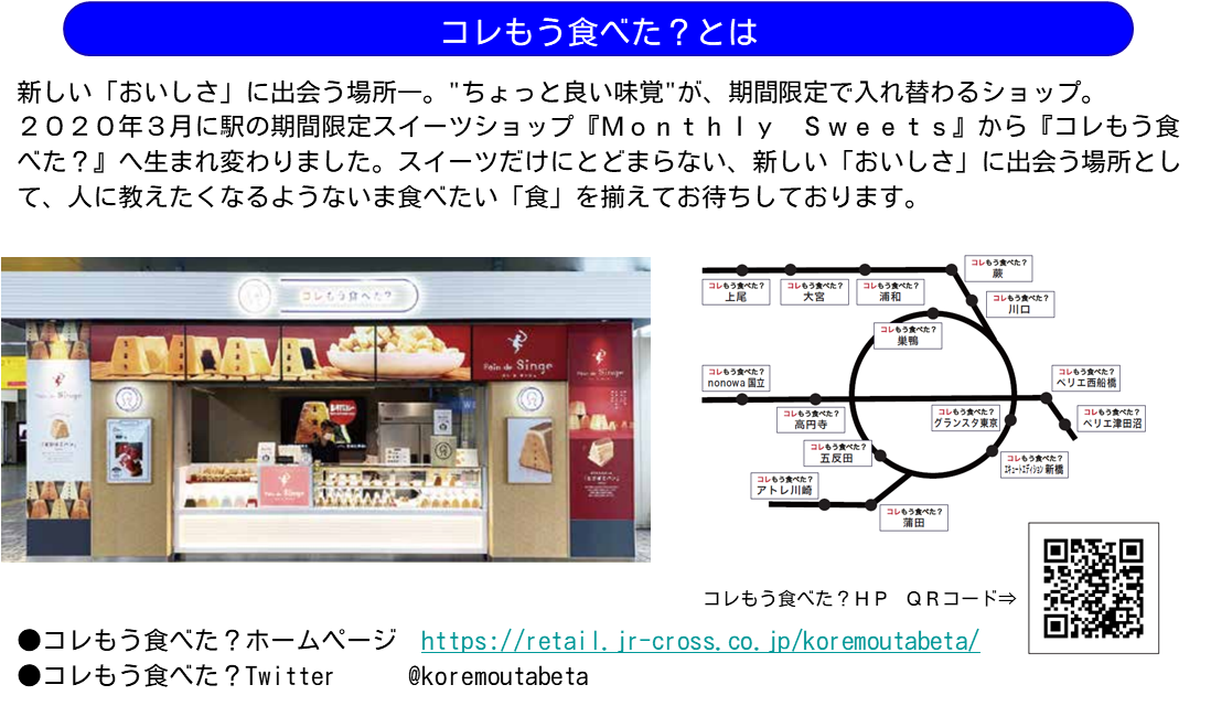 ・『Monthly Sweets』から『コレもう食べた?』に生まれ変わってから3年が経過し、お総菜ブランドの出店も増えてきました。そこで、初の試みとして全店舗でお総菜を取り扱うブランドを展開いたします。