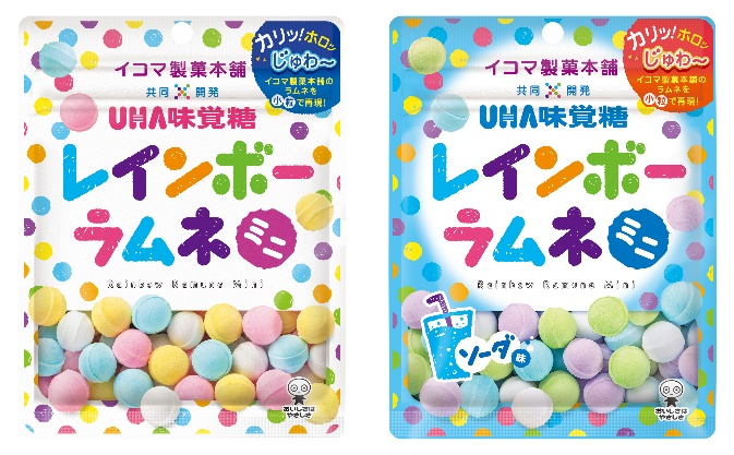 イコマ製菓本舗との共同開発で、レインボーラムネの美味しさはそのままに、小粒でカラフルなラムネに仕上げています。ピーチ味とソーダ味の2種類があります。