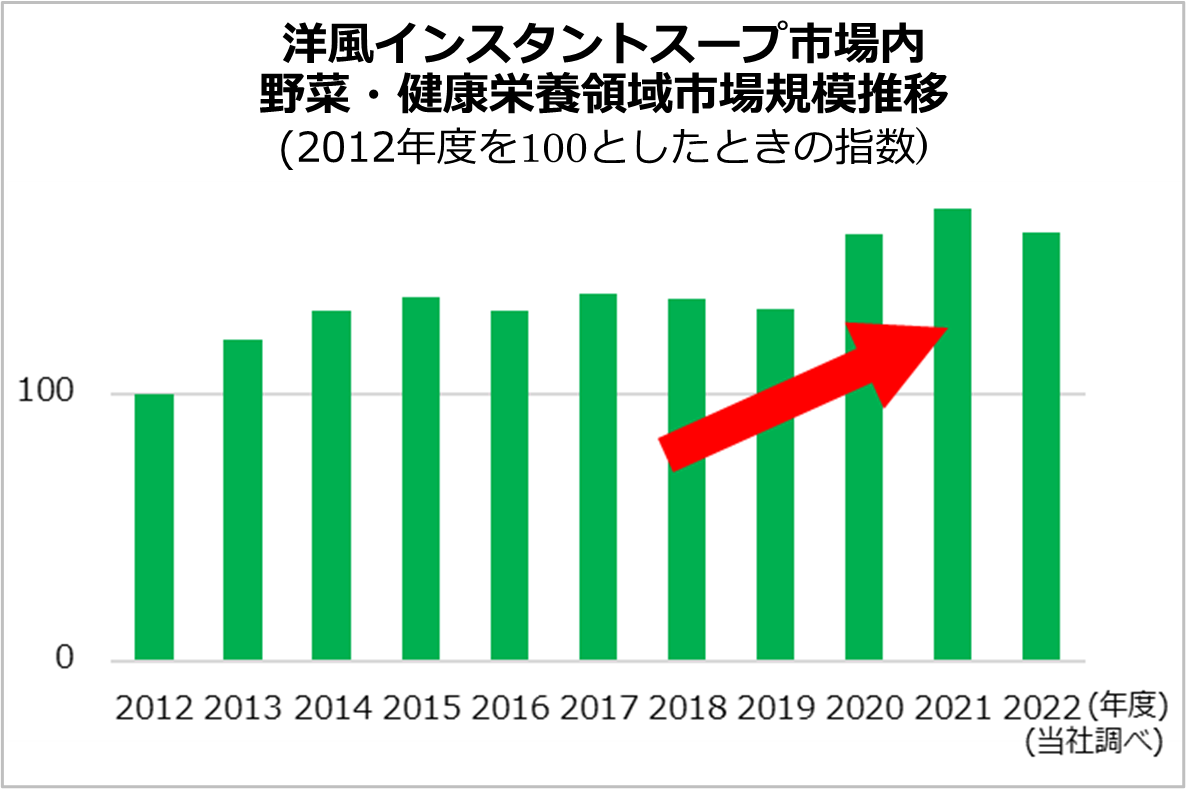 洋風インスタントスープ市場は、野菜やたんぱく質摂取といった生活者の健康ウォンツの高まりを受け、野菜・健康栄養領域を中心に中長期で伸長しています(下図参照)。