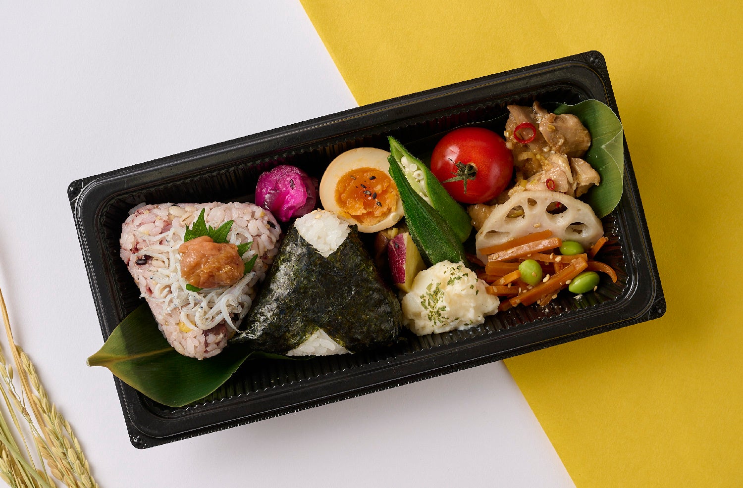 多古米海苔巻きおにぎり1種とenjoy!変わり種おにぎり1種、季節のお惣菜が盛りだくさん入ったお弁当