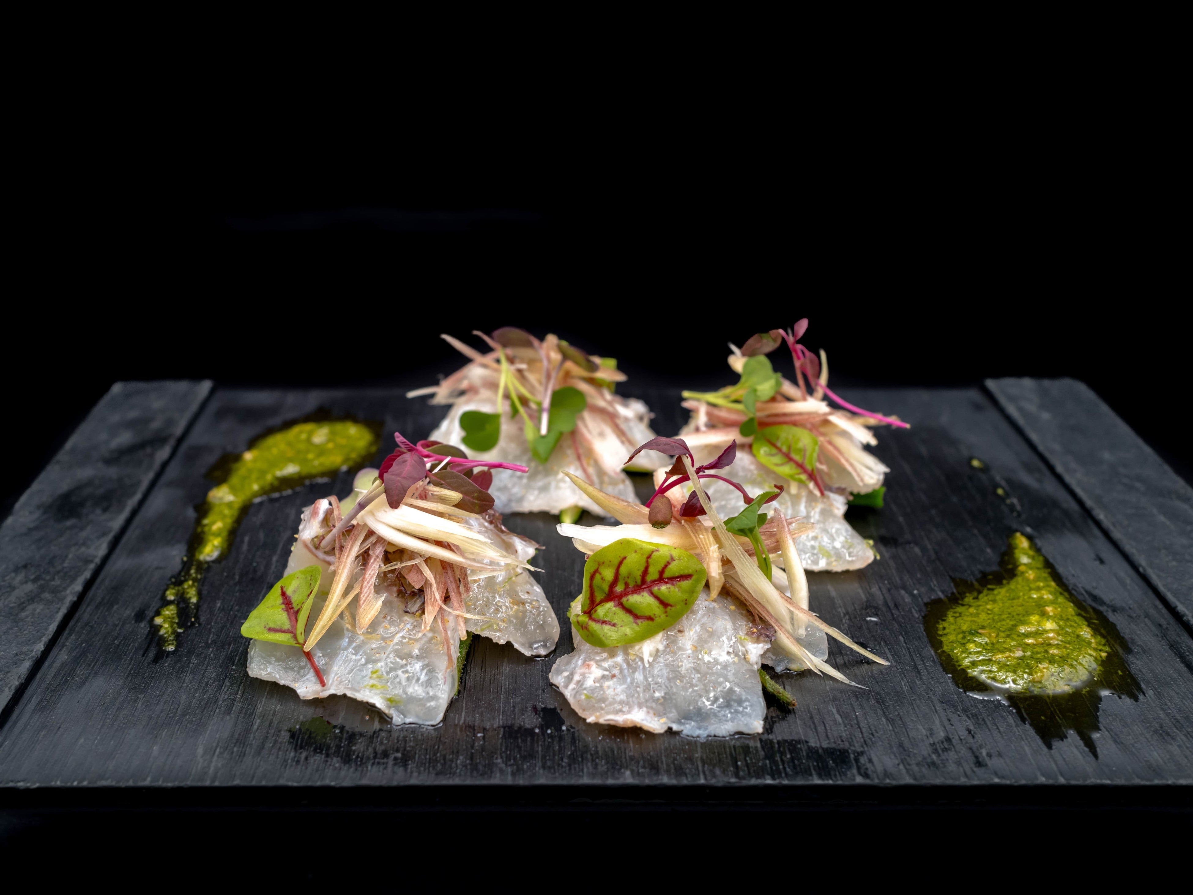 淡白ながらも風味豊かな真鯛をライムの果汁とオリーブオイルでマリネにし、オクラと茗荷を添えてさっぱりとした夏らしい前菜に仕上げました。