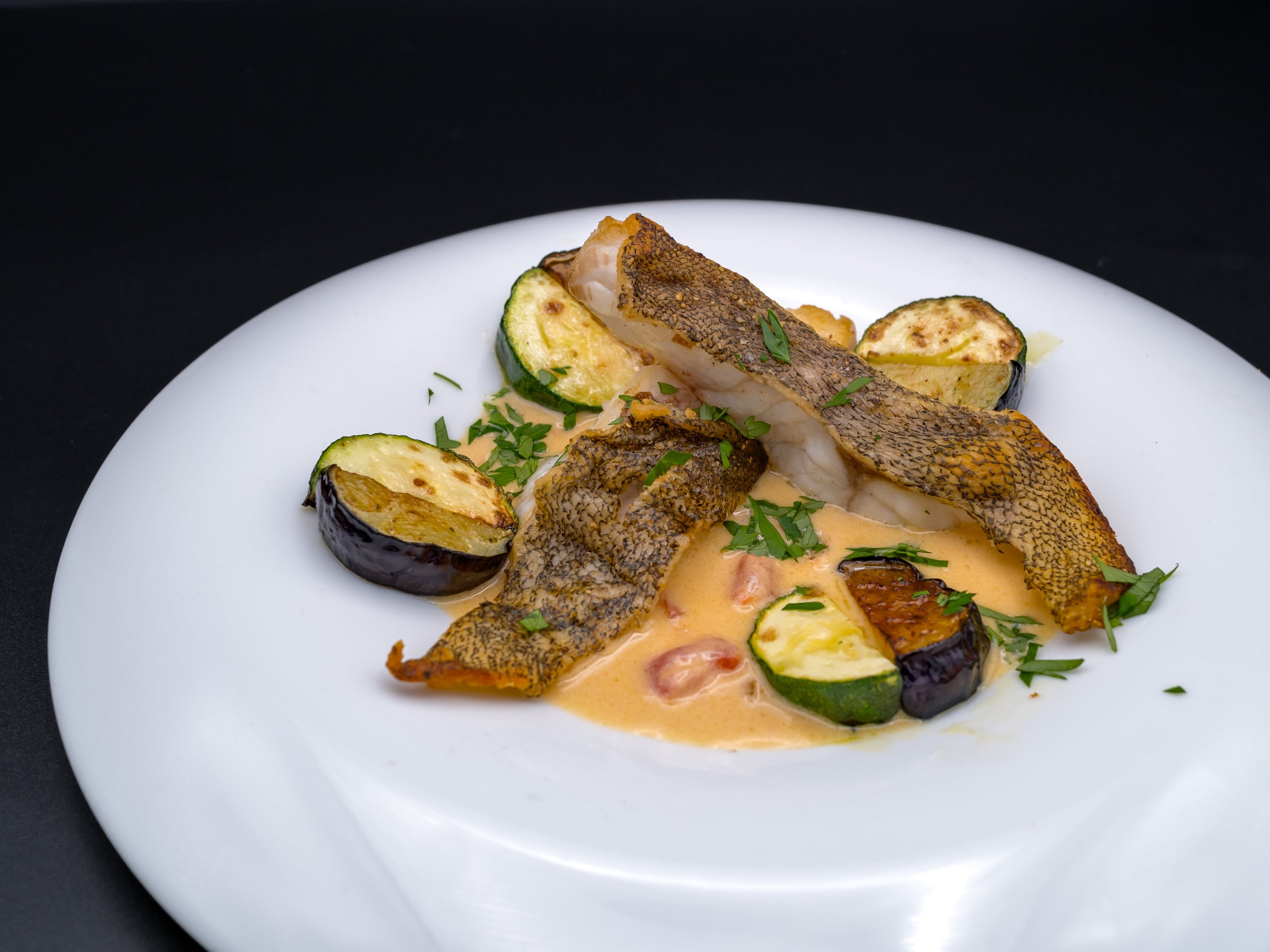 マハタのポワレ 白ワインのソース 夏野菜添え