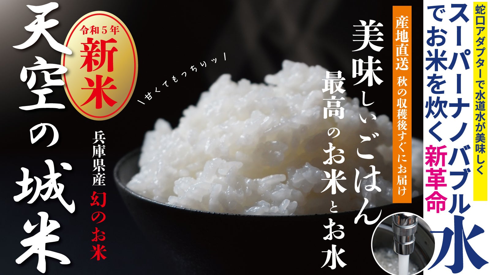 「天空の城米」おいしいお米をお届けするのはもちろんですが、おいしいごはんとして食べてもらえるからこそ幸せを届けられると思い、今回炊飯に大切なお水「”スーパーナノバブル水” 蛇口アダプター」との共同プロジェクトをお届けいたします。