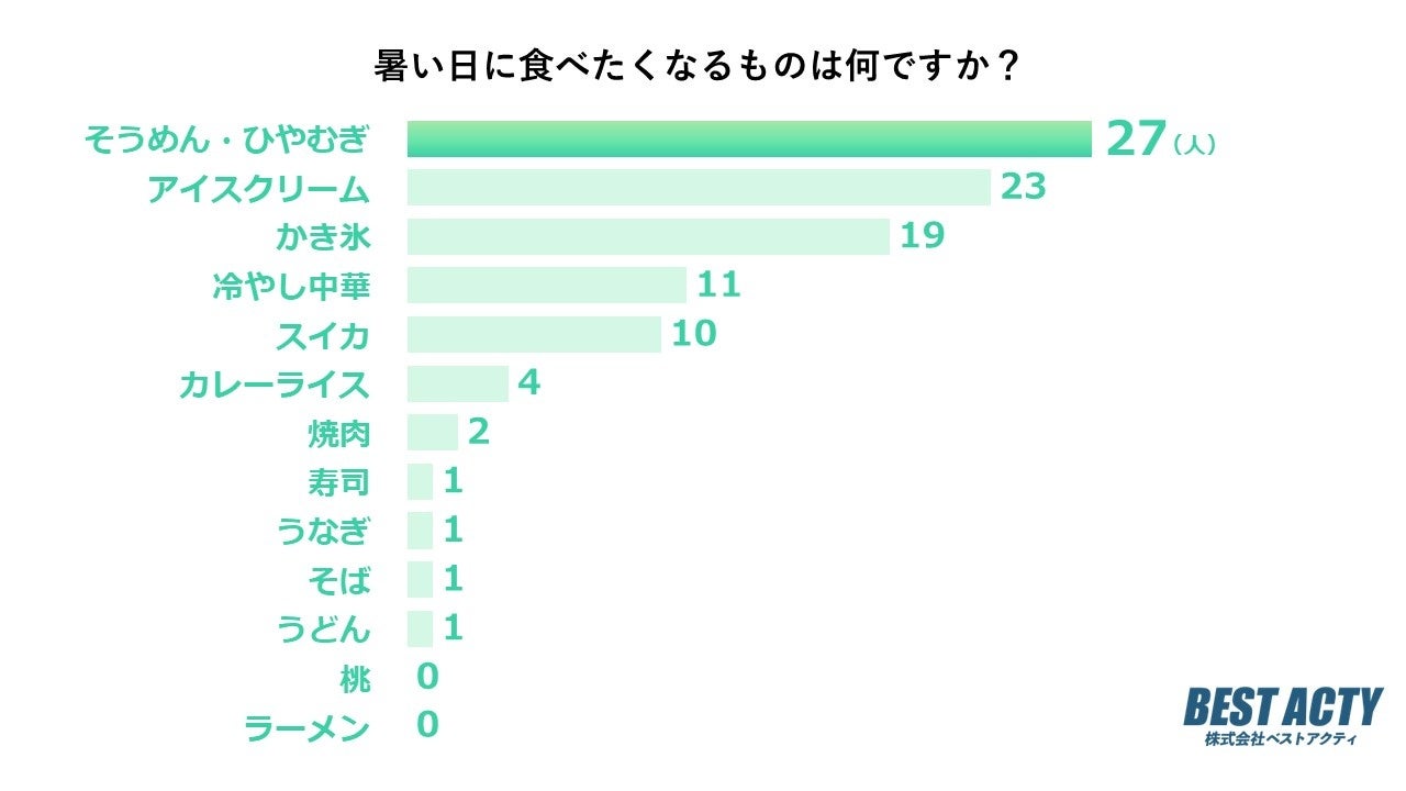 暑い日に食べたくなるものについて100名にアンケートを行ったところ、「そうめん・ひやむぎ」と回答する人が最も多い結果となりました。