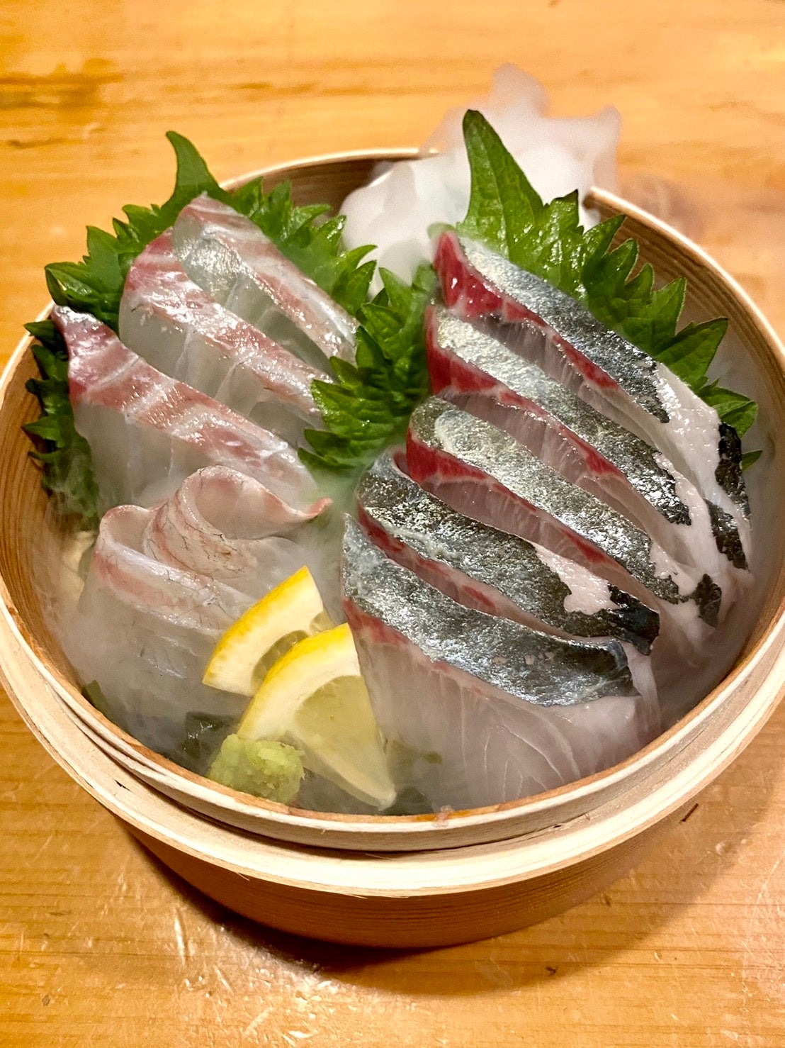 お客様が着席し最初にご提供する ”お通し”が当店自慢の刺し盛り。