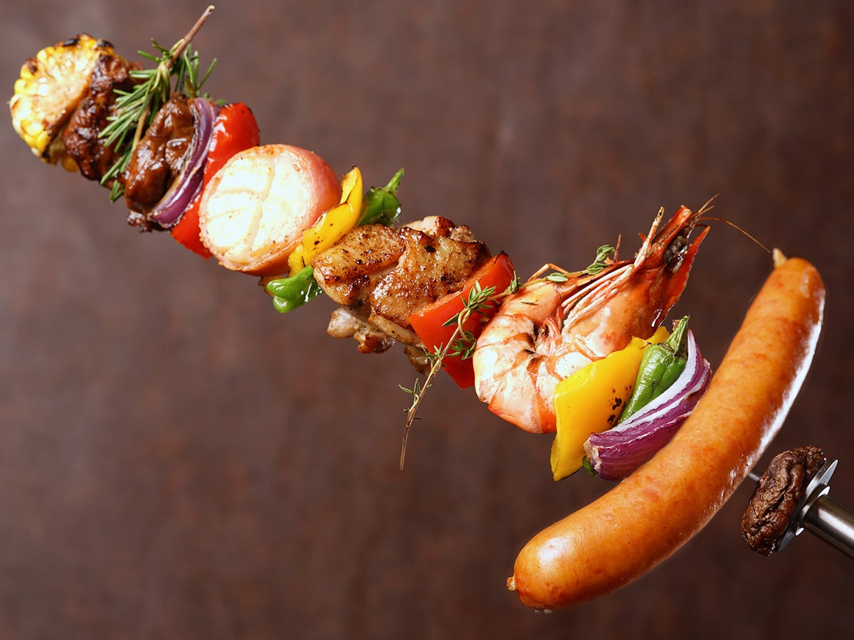洋風串焼きのなかでも、長さ30cmを超える、豪快なBBQ!牛肉・鶏肉・魚介・野菜を鉄串(サーベル)に刺して焼き上げます。甘みとスパイスの効いた特製タレに、ローズマリーやタイムなどの香草が薫る、ビールが進む一品です。